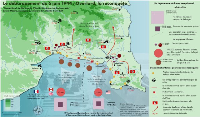Le chapitre 3 du programme de terminale générale fixe un point de passage et d’ouverture sur le débarquement du 6 juin 1944 en Normandie et l’opération Bagration. La cartographie ci-dessous s’attache à l’opération Overlord menée par les Alliés. Elle est complétée par un corpus documentaire qui permet de lier l’étude aux approches plus générales sur cette question telles que l’étendue du conflit ou l’extrême violence et les enjeux de la guerre.
